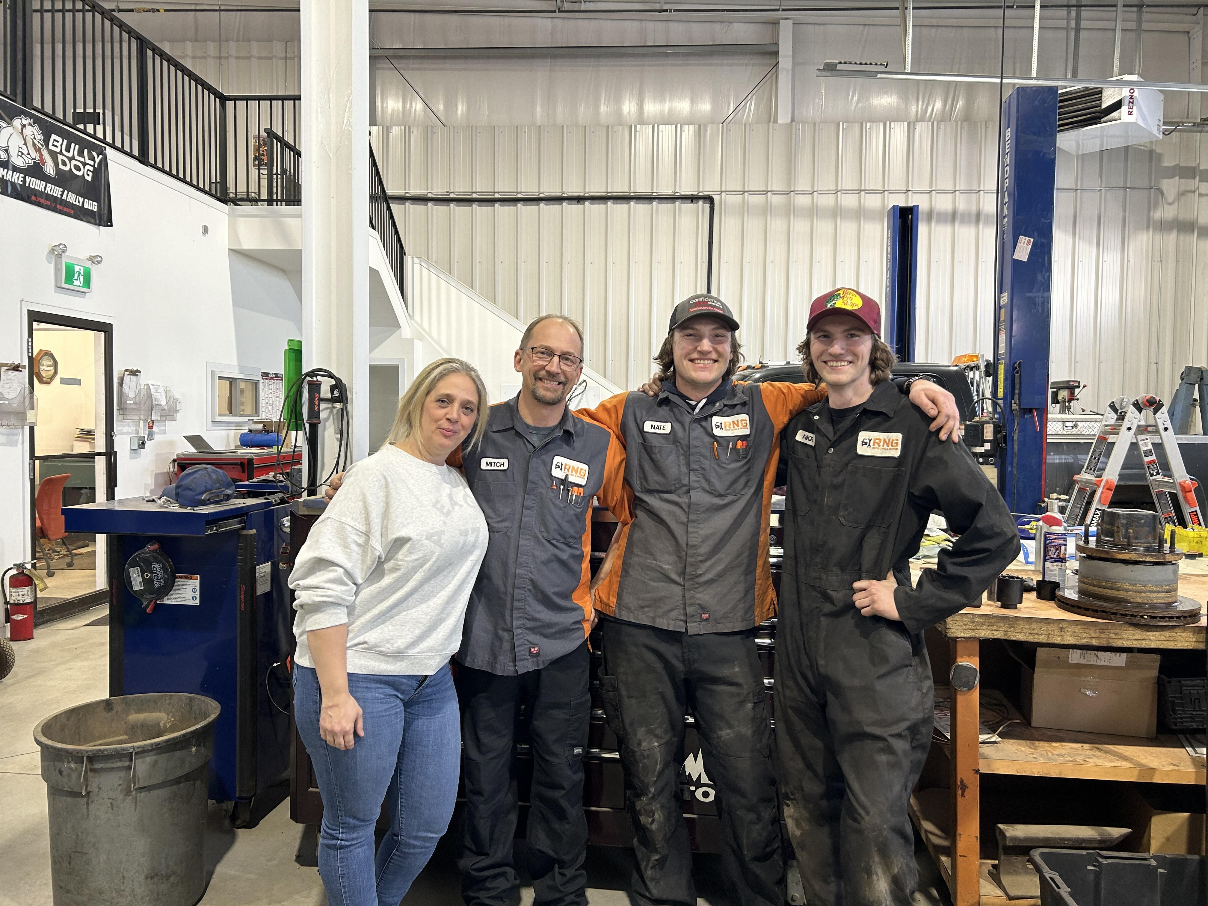 Hi, we’re Traci and Mitch, owners of RNG Auto Care & Repair, a locally owned and operated shop right off the QE2 in Olds, Alberta. With our skilled team—including Nate, our experienced journeyman mechanic, and apprentices Kaleb and Nigel—we’re committed to providing top-quality automotive repair and maintenance to our community and beyond.